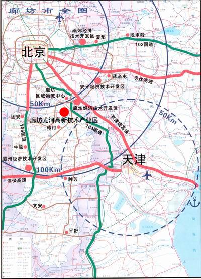廊坊新兴产业示范区位于京津冀结合体,环渤海中心区,北接北京市、东临天津市,距离廊坊20公里,距离北京、天津中心区各60公里,位于首都经济圈中心地带。